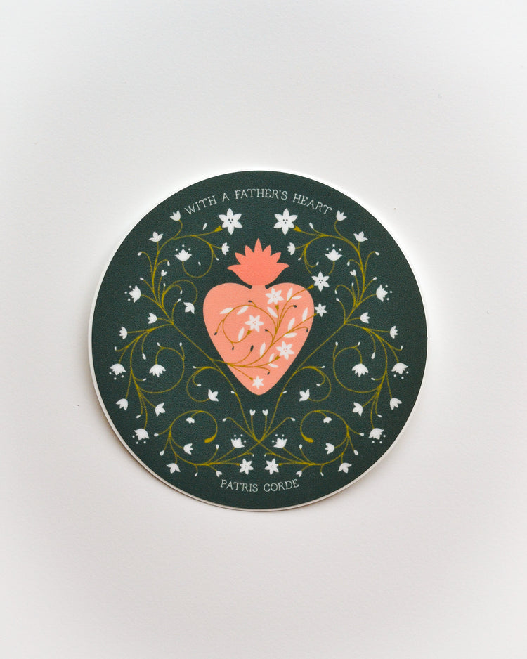 Honor the Chaste Heart of St. Joseph with this beautiful Catholic sticker featuring the inscription “With a Father’s Heart – Patris Corde.”