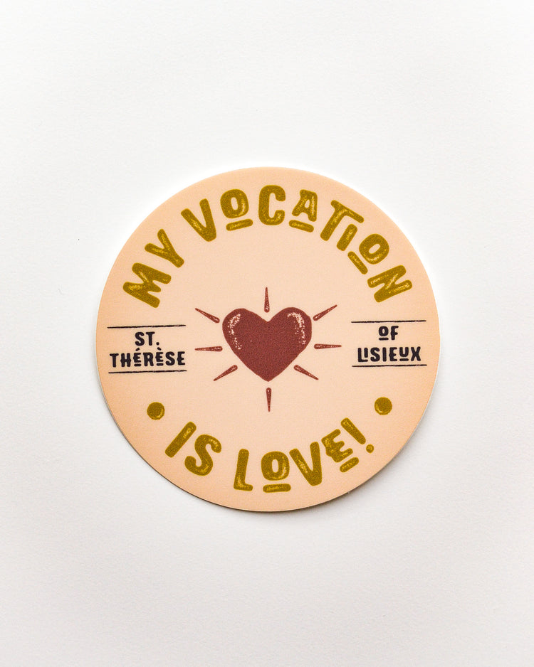 This round vinyl sticker captures her radiant spirit with warm colors and a simple heart design. Whether placed on your laptop, journal, or water bottle, it serves as a gentle reminder that every vocation, every life, is rooted in love.